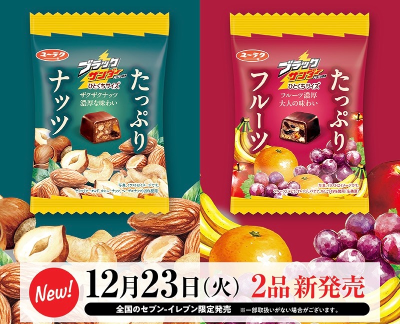 本商品は「ブラックサンダー×たっぷり素材」をテーマにした、ナッツとフルーツの2品展開で発売いたします。ブラックサンダーならではのザクザク食感に、それぞれの素材を贅沢に配合しました。