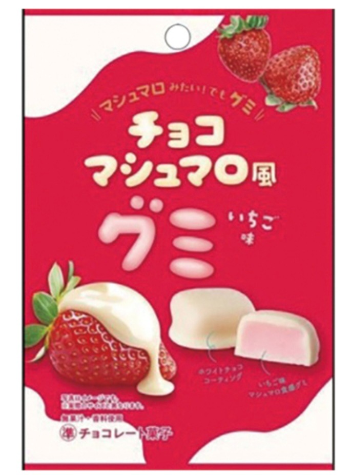 マシュマロのようなふんわり食感のいちご味のグミに、優しい甘さのホワイトチョコをコーティングしました。
