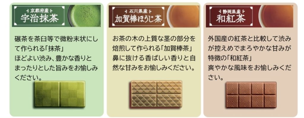 ・京都府産宇治抹茶、石川県産加賀棒ほうじ茶、静岡県産和紅茶を使用したチョコレートの3種アソート