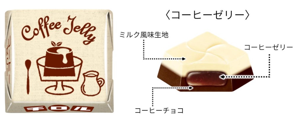 センターにコーヒーゼリーを閉じ込めることで噛んだ時にぷるぷる食感が口いっぱいに広がります。