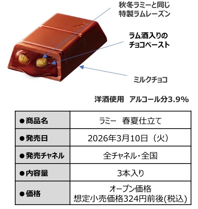 - 特製ラムレーズンとなめらかなラム酒入りチョコペーストをミルクチョコで包み、柔らかな食感となめらかなくちどけがお楽しみいただけます。